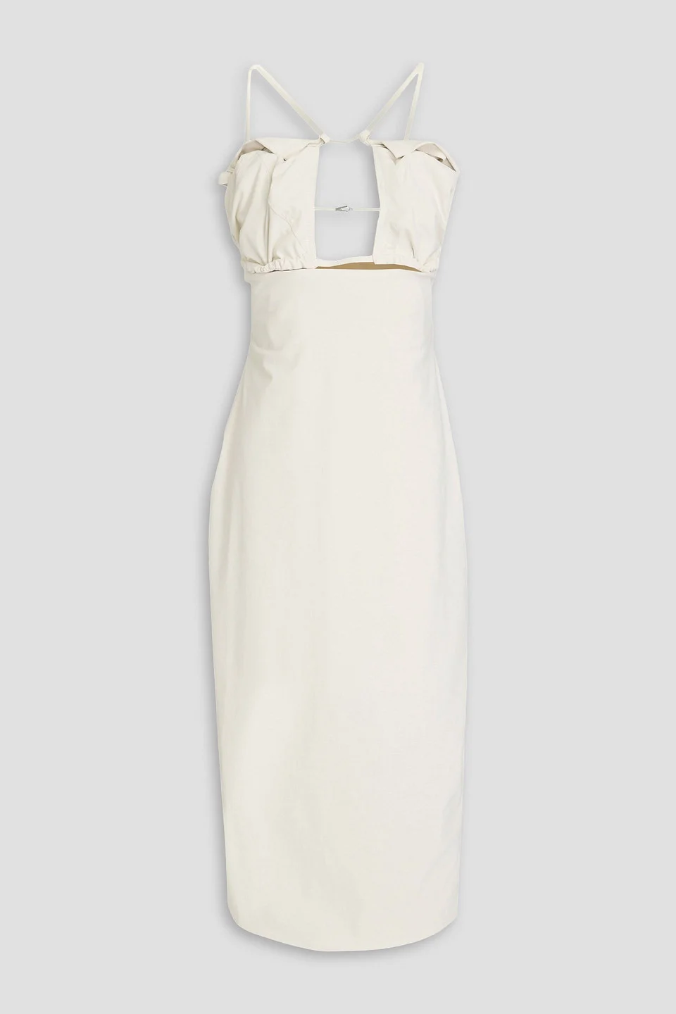 Dress twill cutout ruffled underwired cups back split clasp fastening at back ties at back concealed hook and zip fastening at back partially lined mid-weight, stretchy fabric dry clean imported 55% Polyamide 36% Cotton 9% Elastane Product Code 1647597348623357