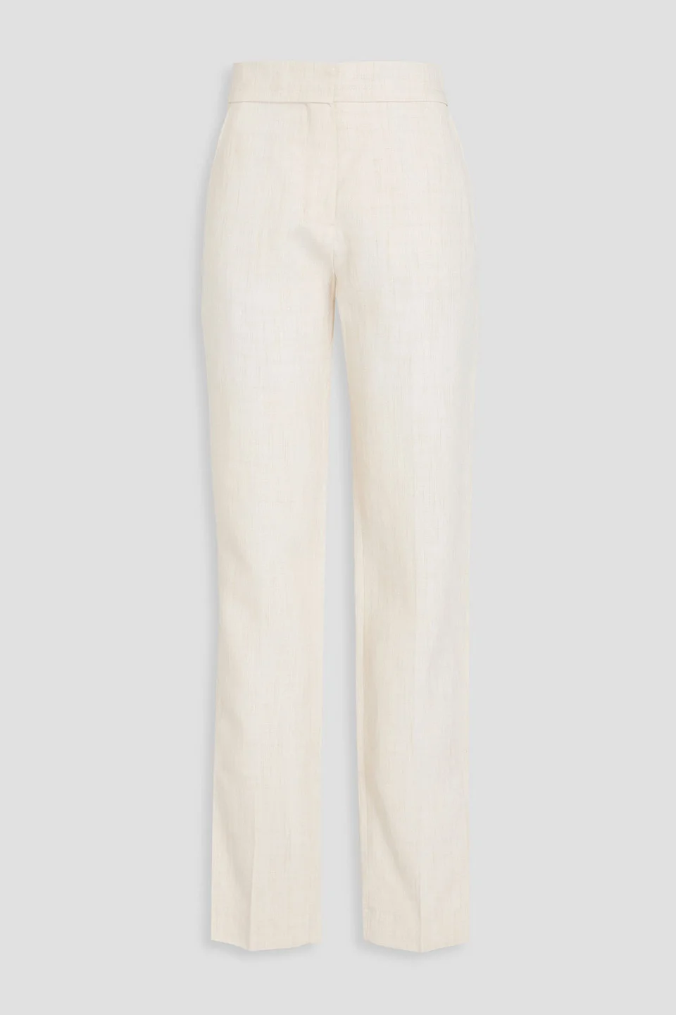 Straight-leg pants linen-blend pressed creases front slant pockets back welt pocket high-rise cut slit cuffs concealed hook and zip fastening at front mid-weight, non-stretchy fabric dry clean imported 60% Linen 26% Viscose 14% Polyester Product Code 46376663162864311