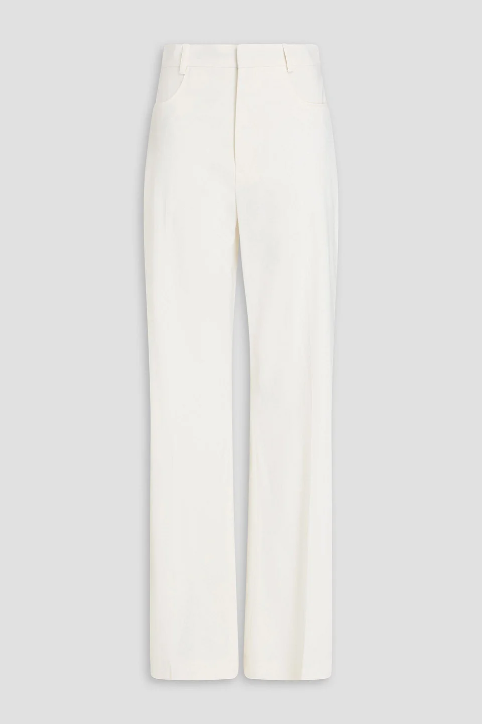 Flared pants woven pressed creases two front slant pockets belt loops high-rise cut concealed hook, button and zip fastening at front mid-weight, non-stretchy fabric dry clean imported 53% Viscose 45% Virgin Wool 2% Elastane Product Code 46376663162865024