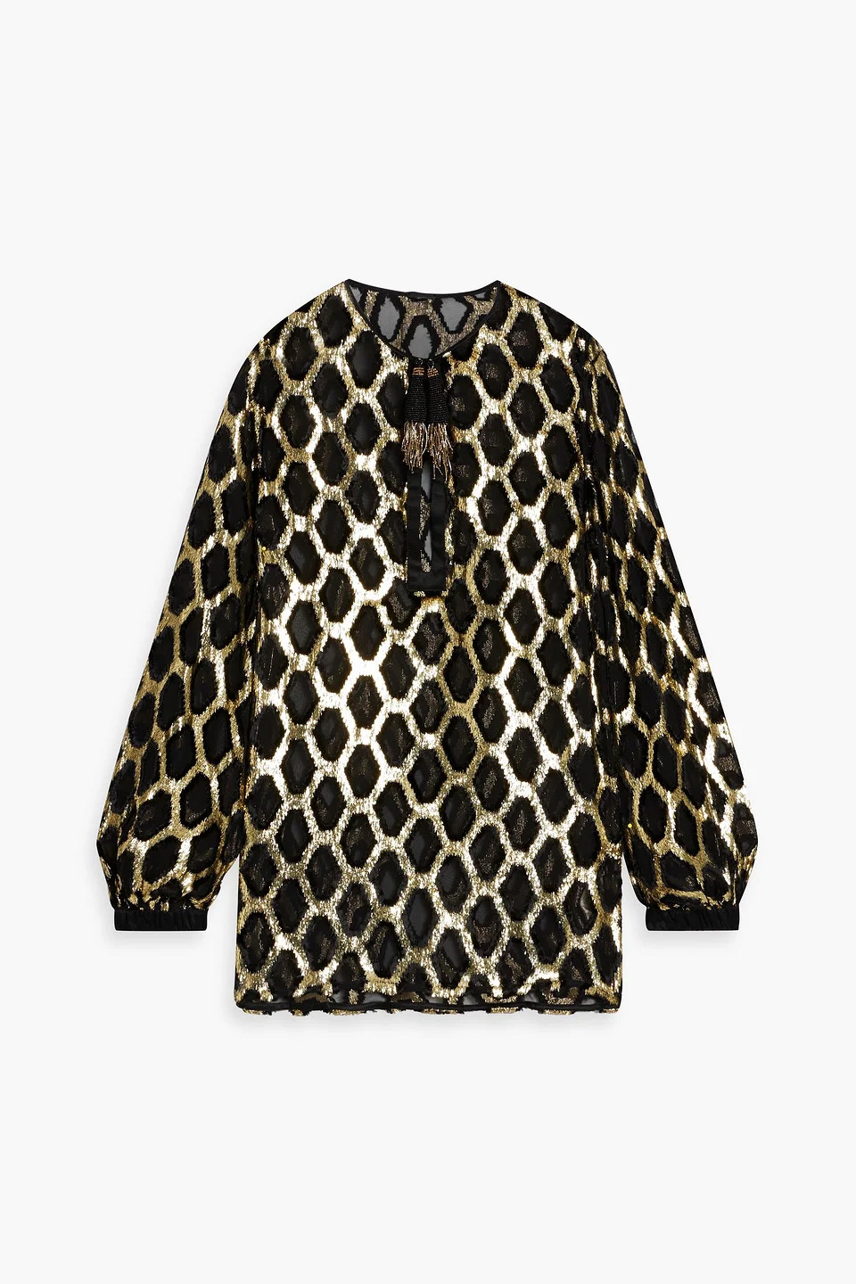 Blouse metallic fil coupe chiffon beads tassels buttoned cuffs hook-fastening keyhole at front lightweight, non-stretchy fabric dry clean imported 62% Viscose 38% Silk Product Code 46376663162898917