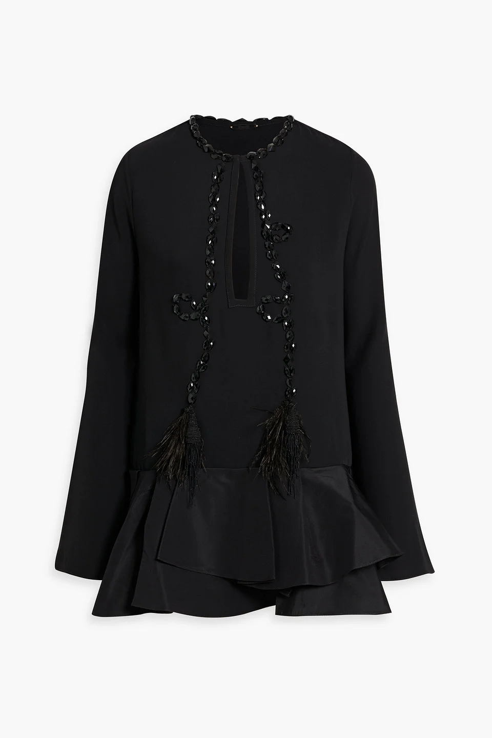Dress crepe taffeta crystals feather trims tassels ruffled hem hook-fastening keyhole at front mid-weight, non-stretchy fabric dry clean imported 80% Polyester 15% Resin glass 5% Feather Product Code 46376663162898947