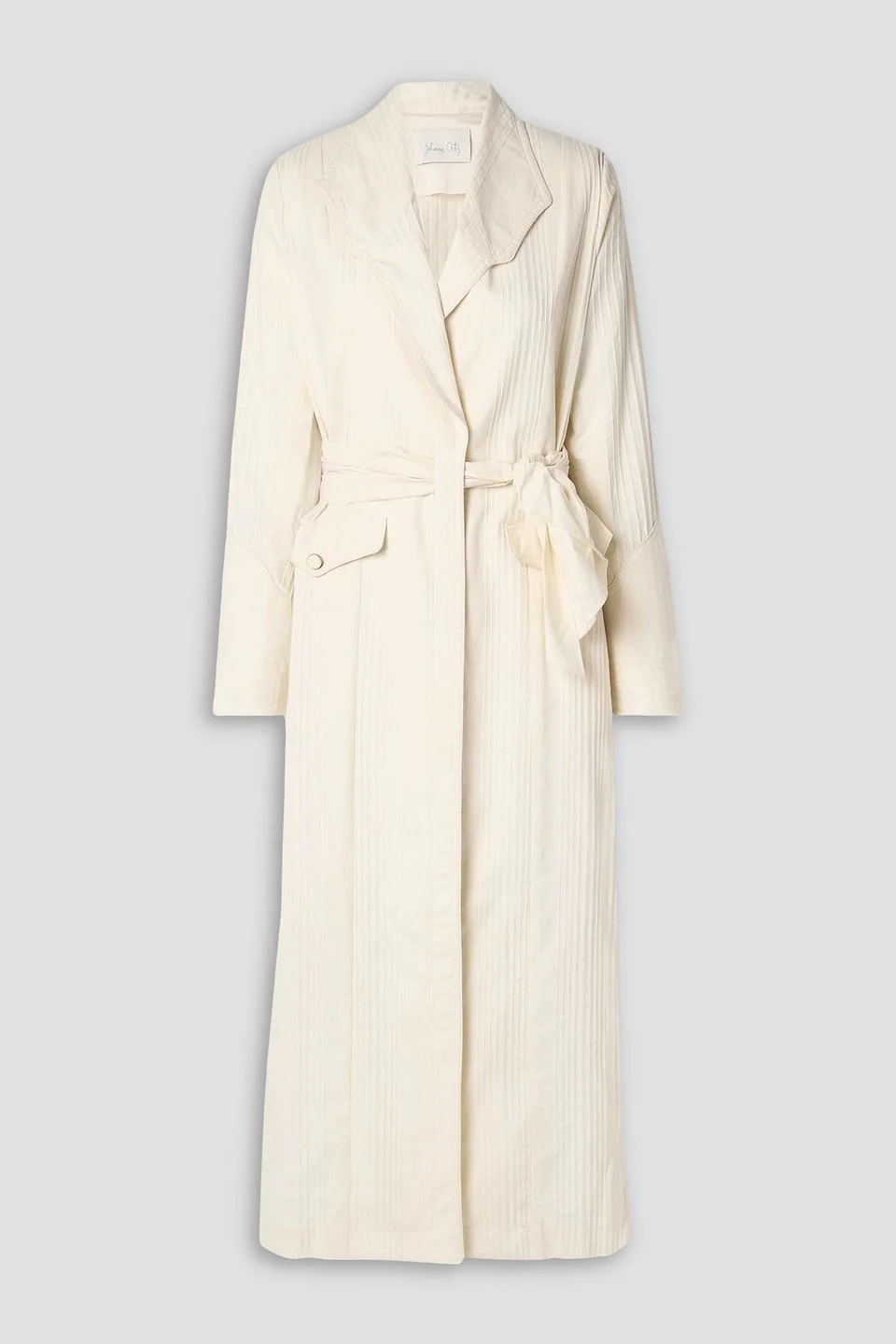 Trench coat cotton shoulder pads waist ties buttoned cuffs front flap pockets partially lined concealed button fastenings through front mid-weight, non-stretchy fabric dry clean imported 100% Cotton Product Code 1647597333527182