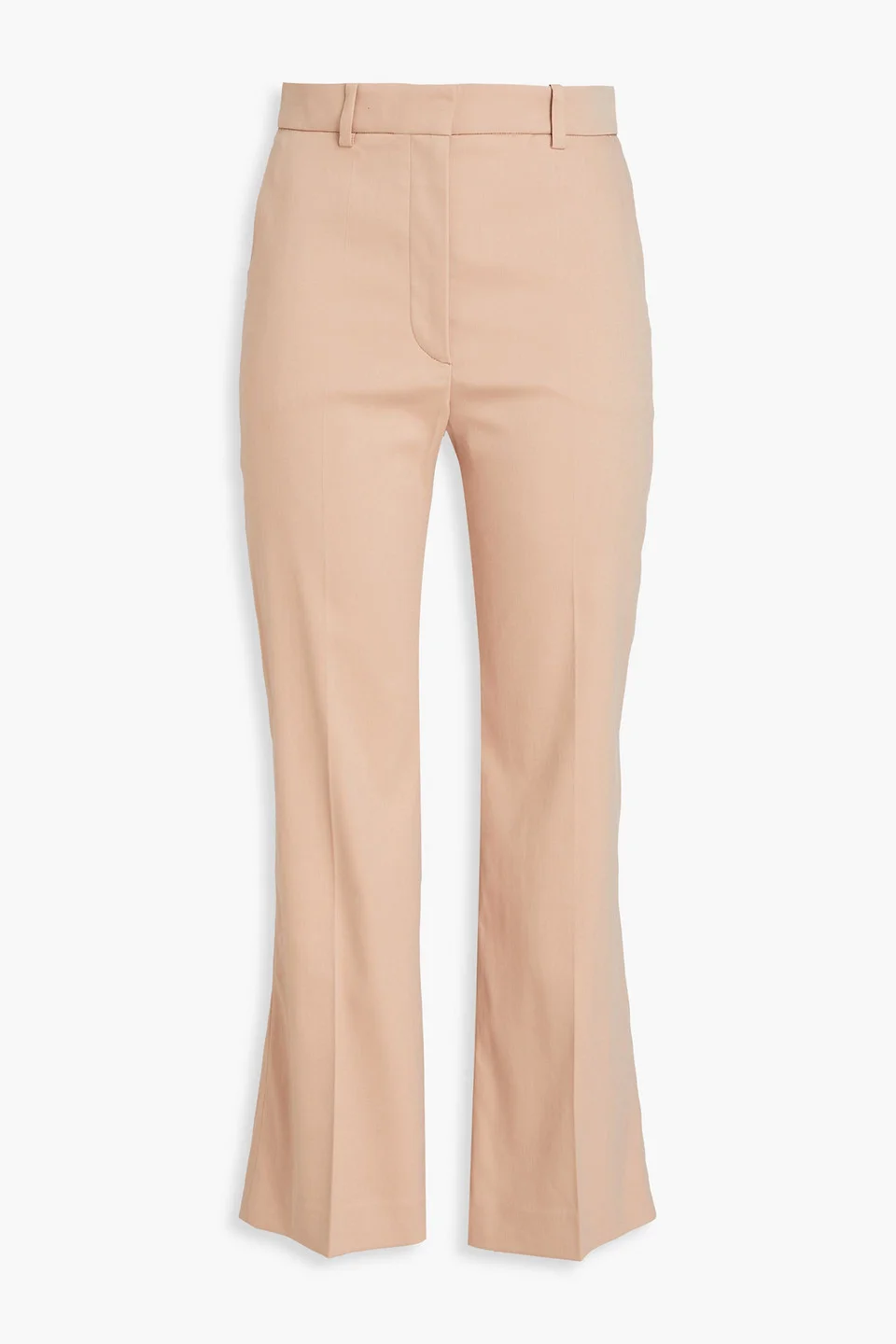 Kick-flare pants poplin cotton-blend pressed creases two side slant pockets two back welt pockets belt loops high-rise cut concealed hook, button and zip fastening at front mid-weight, stretchy fabric dry clean imported 53% Cotton 42% Viscose 5% Elastane Product Code 1647597349914673