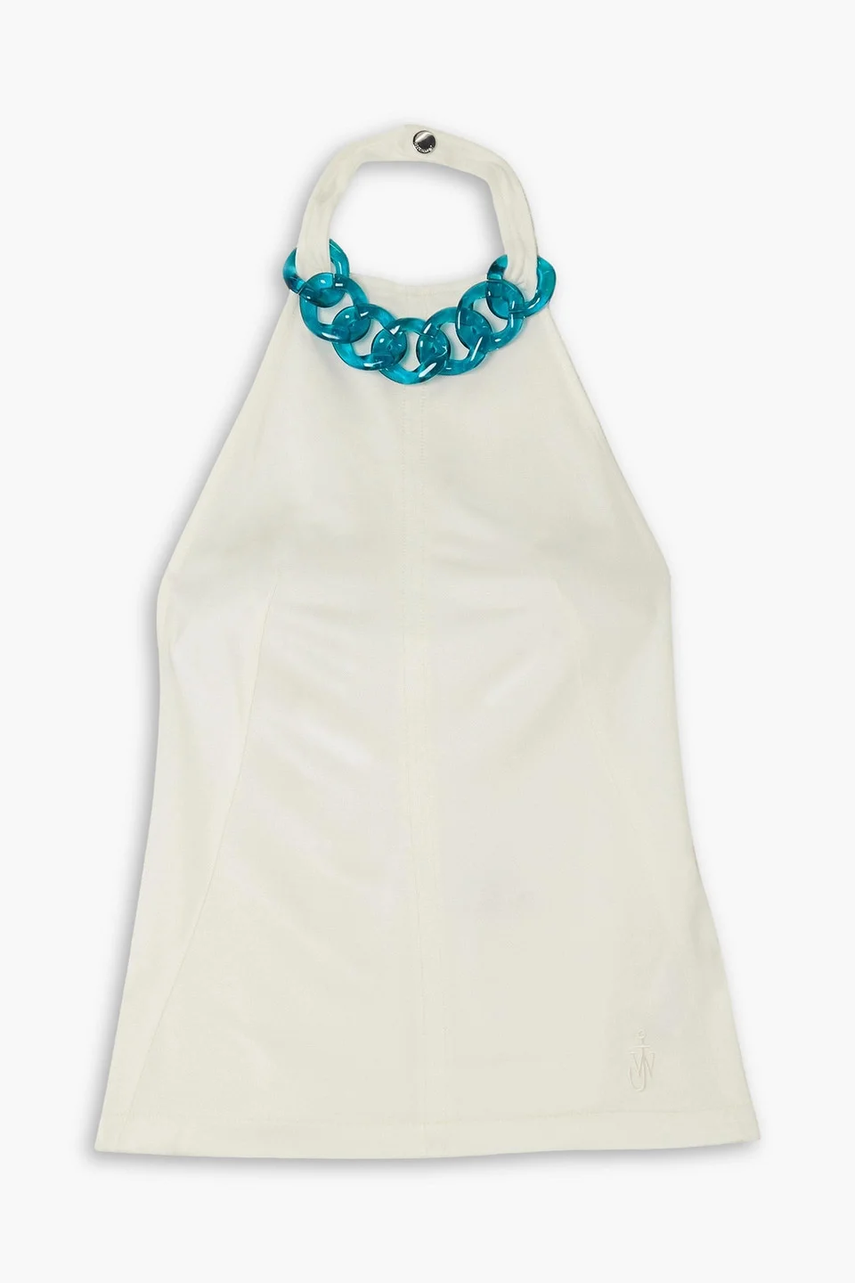 Top gabardine chain-embellished halterneck concealed hook and zip fastening at back snap fastenings at neck slightly stretchy fabric mid-weight fabric dry clean imported 100% Viscose Product Code 1647597321418300