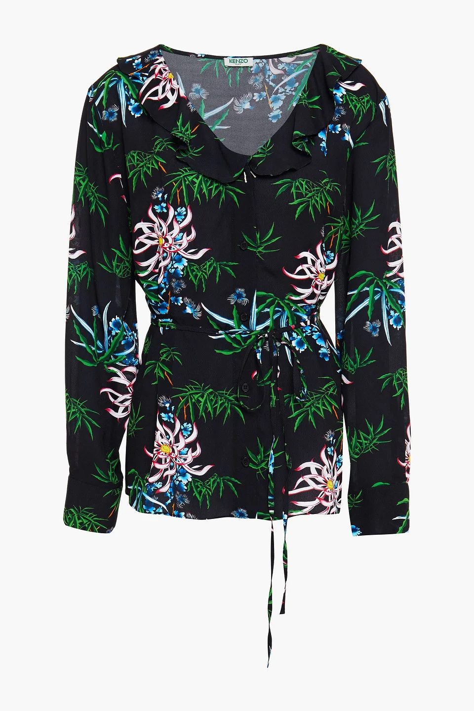 Blouse floral-print crepe ruffled trims detachable waist tie buttoned cuffs button fastenings through front non-stretchy fabric mid-weight fabric dry clean imported 100% Viscose Product Code 15546005222348897