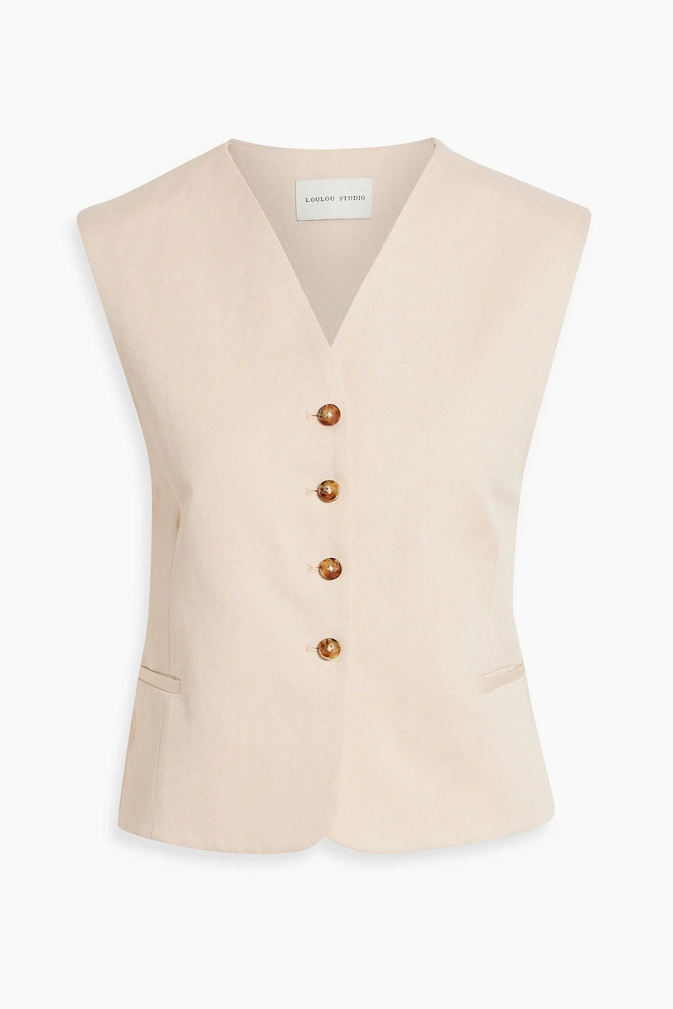 Vest twill cotton and linen-blend half-belt two front welt pockets button fastenings through front fully lined mid-weight, non-stretchy fabric hand wash or dry clean imported 61% Cotton 39% Linen Product Code 46376663162835948