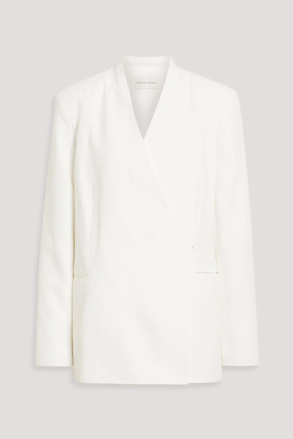 Blazer twill shoulder pads buttoned cuffs two front welt pockets concealed hook and button fastenings along front fully lined dual back vents mid-weight, non-stretchy fabric hand wash or dry clean imported 85% Viscose 15% Linen Product Code 46376663162835036