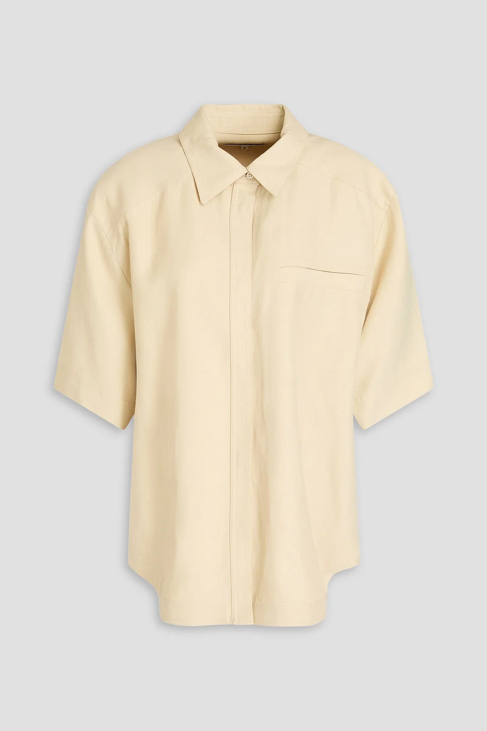 Shirt twill breast pocket curved hem partially concealed button fastenings through front hand wash or dry clean imported 85% Viscose 15% Linen Product Code 46376663162837599
