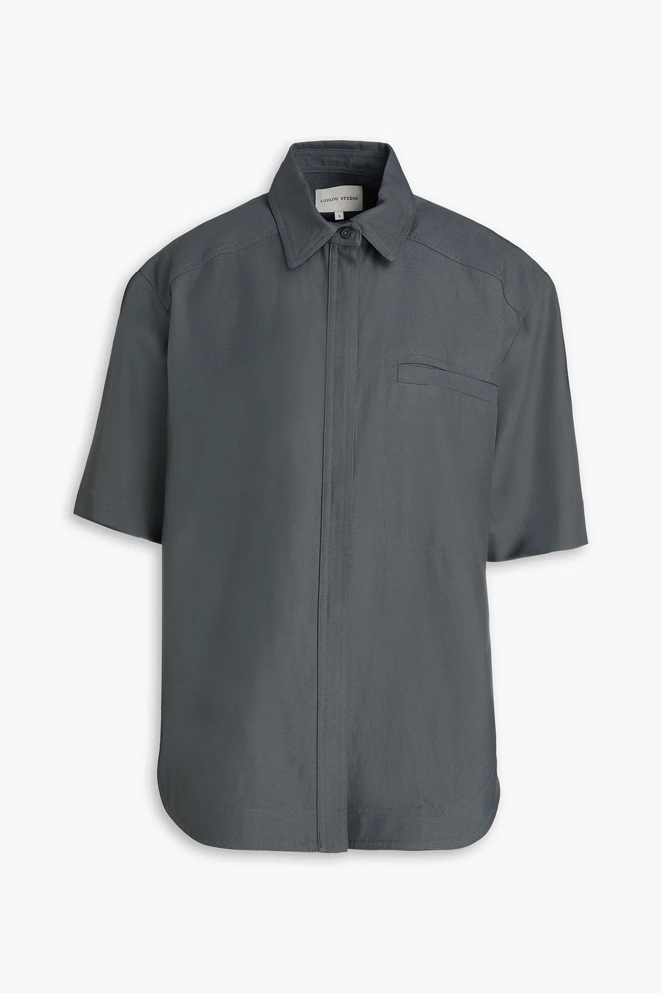 Shirt twill breast pocket curved hem partially concealed button fastenings through front hand wash or dry clean imported 85% Viscose 15% Linen Product Code 1647597360241692