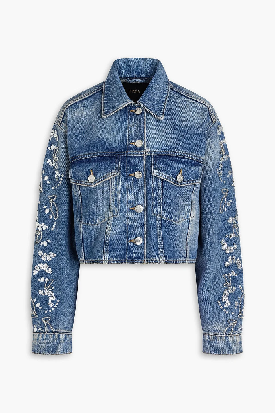 Jacket faded denim embroidered crystals sequins cropped buttoned cuffs breast pockets button fastenings through front mid-weight, non-stretchy fabric hand wash imported 100% Cotton Product Code 46376663162960347