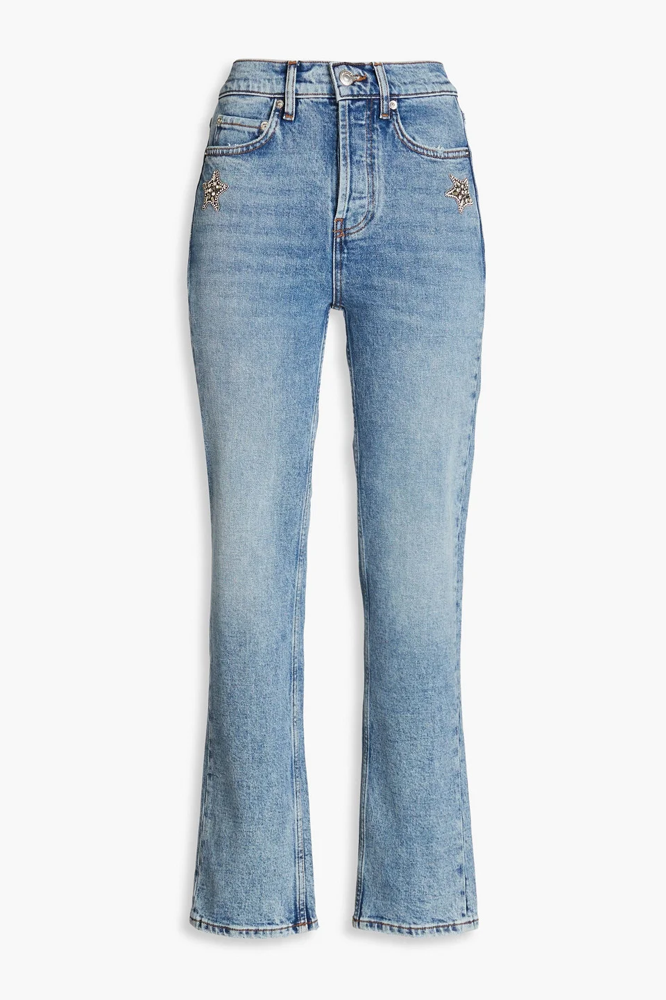 Straight-leg jeans denim crystals high-rise cut five pockets partially concealed button fastenings along front mid-weight, slightly stretchy fabric machine wash imported 99% Cotton 1% Elastane Product Code 1647597349603012