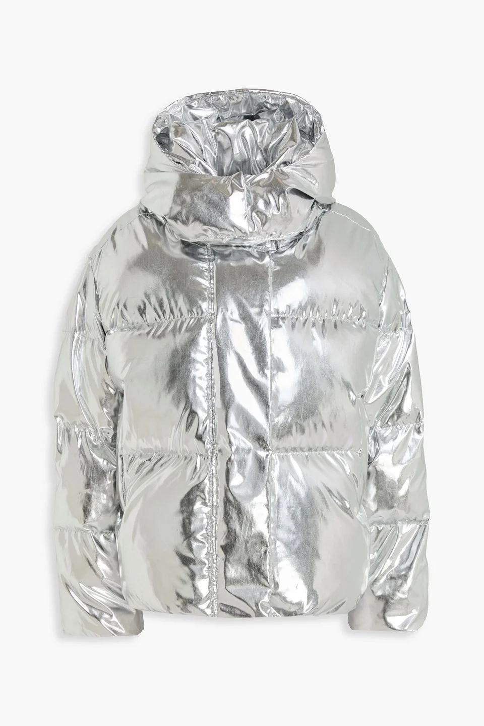 Jacket metallic quilted shell detachable hood side slit pockets snap and concealed zip fastenings through front synthetic filling drawstring hem mid-weight, non-stretchy fabric dry clean imported 100% Polyester Product Code 46376663162951407
