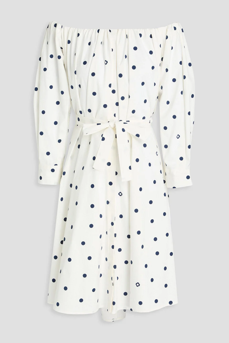 Off-the-shoulder dress polka-dot cotton-blend poplin elasticated neckline detachable waist tie belt loops asymmetric hem concealed button fastenings through front mid-weight, slightly stretchy fabric machine wash or dry clean imported 97% Cotton 3% Elastane Product Code 46376663162958933
