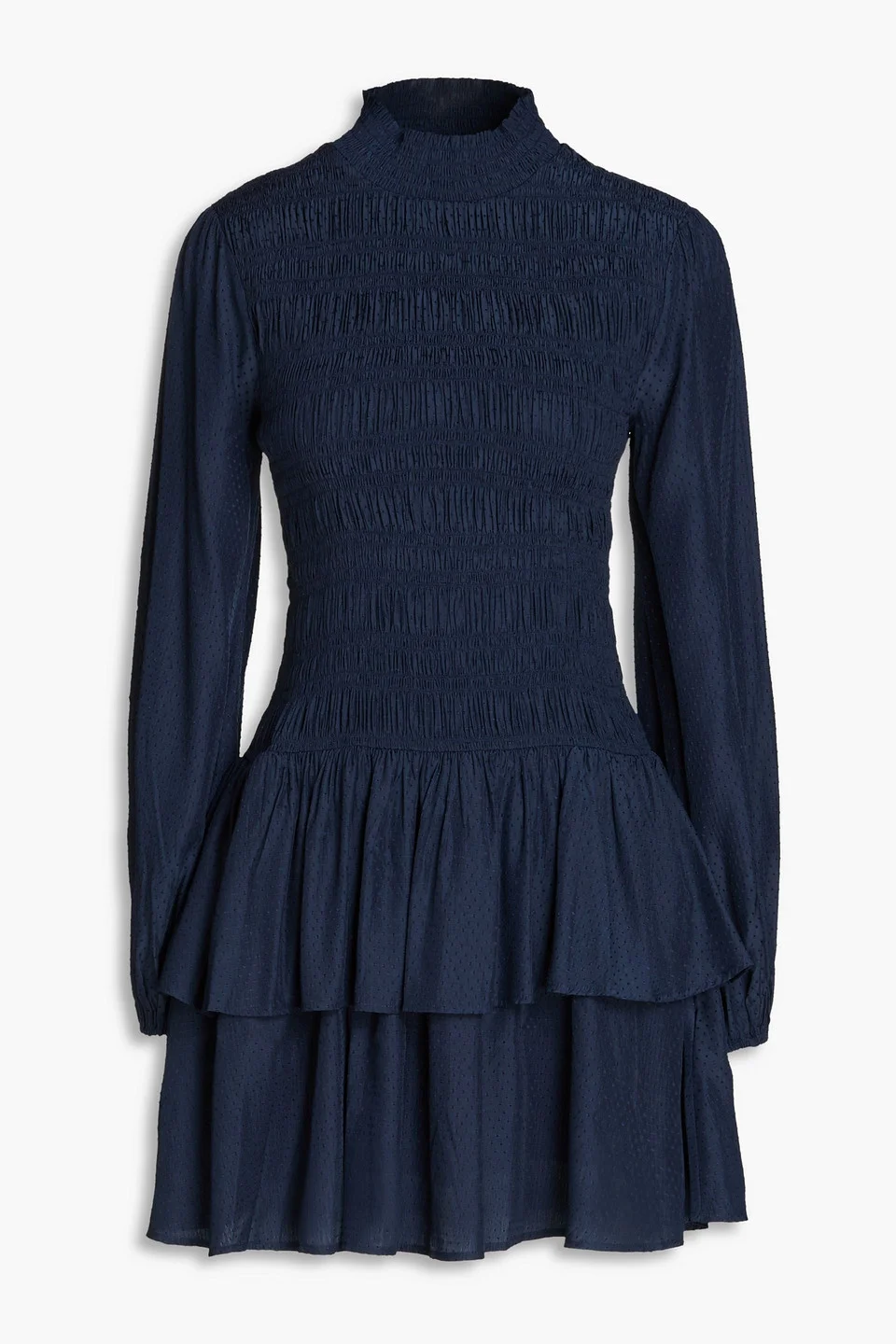 Shirred ruffled Swiss-dot mini dress