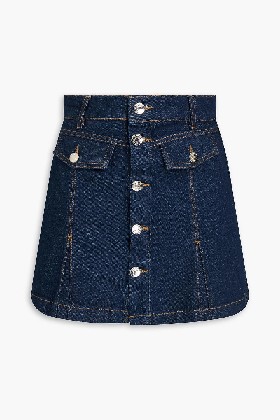 Shorts denim skirt-style overlay belt loops high-rise cut faux pockets back patch pockets button fastenings through front mid-weight, stretchy fabric machine wash or dry clean imported 97% Cotton 3% Elastane Product Code 46376663162960032