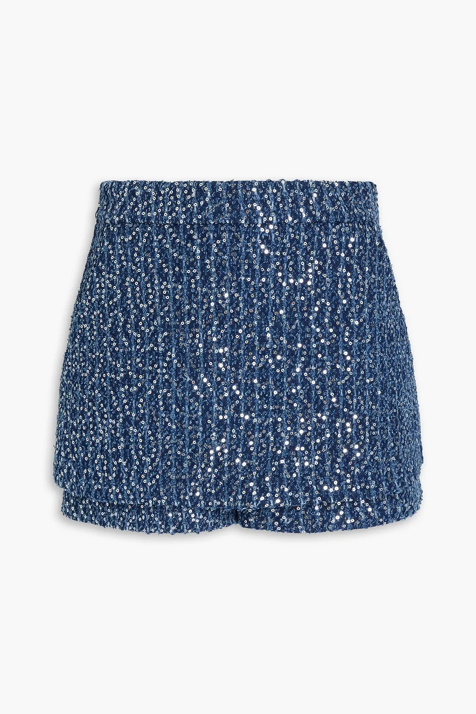 Shorts denim frayed sequins skirt-style overlay partially elasticated waist high-rise cut side slant pockets concealed zip fastening along back fully lined mid-weight, non-stretchy fabric dry clean matching jacket also available made in france 80% Cotton 20% Polyester Product Code 46376663162950151