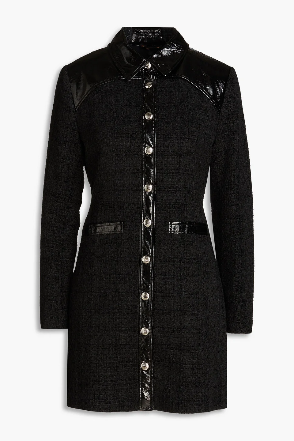 Shirt dress boucle-tweed glossed trims front slit pockets snap fastenings through front fully lined mid-weight, non-stretchy fabric dry clean imported 91% Polyester 9% Wool Product Code 1647597349726042