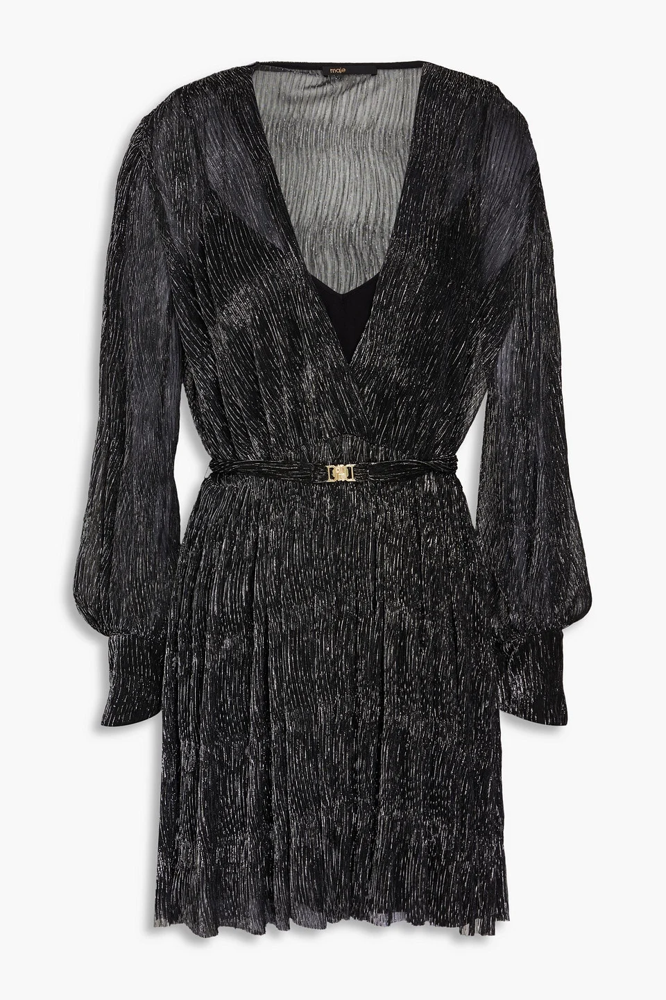 Dress metallic knitted gathered wrap-effect detachable belt elasticated waist puffed sleeves buttoned cuffs slips on detachable slip to line lightweight knit hand wash imported 59% Polyester 41% Metallic fiber Product Code 1647597349708028