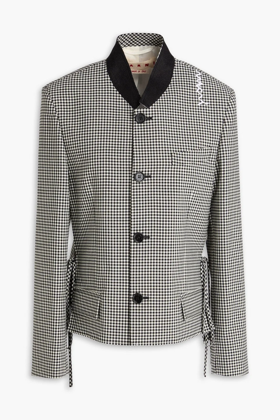 Jacket gingham jacquard horn buttons shoulder pads lace-up sides embroidered logo felt trims front flap pockets breast pocket button fastenings through front fully lined side slits mid-weight, non-stretchy fabric dry clean made in italy 53% Polyester 43% Virgin Wool 4% Elastane 0% Buffalo Horn Product Code 46376663162993052