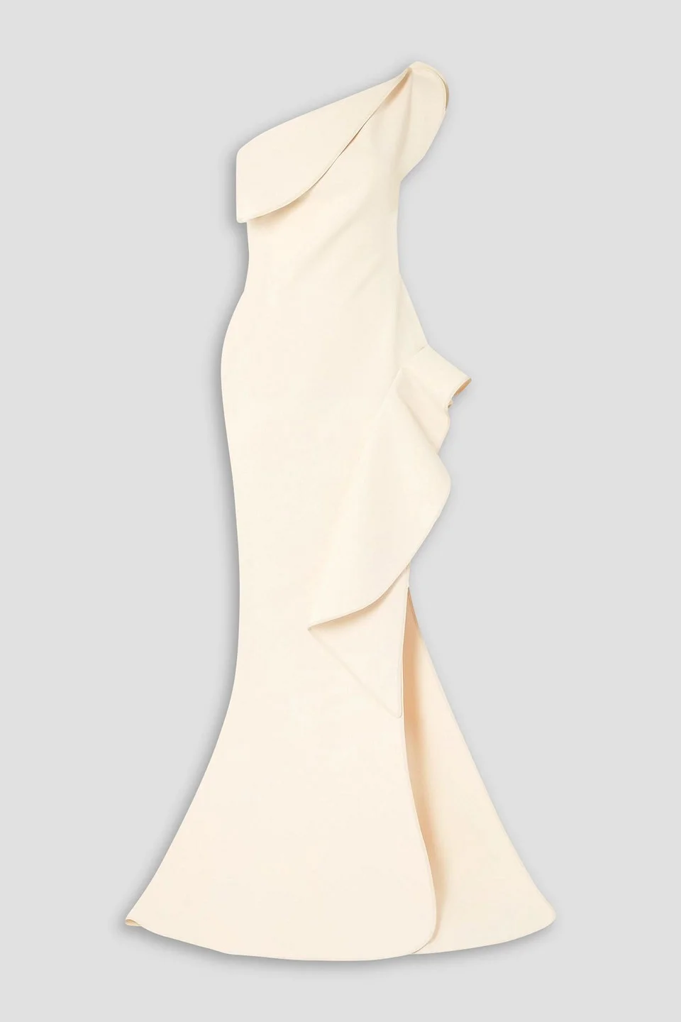 Designed to frame your decolletage, wear yours with swept-up hair and statement earrings gown crepe ruffled draped front slit train hem concealed zip fastening along side mid-weight, slightly stretchy fabric dry clean imported 100% Polyester Product Code 46376663163076665
