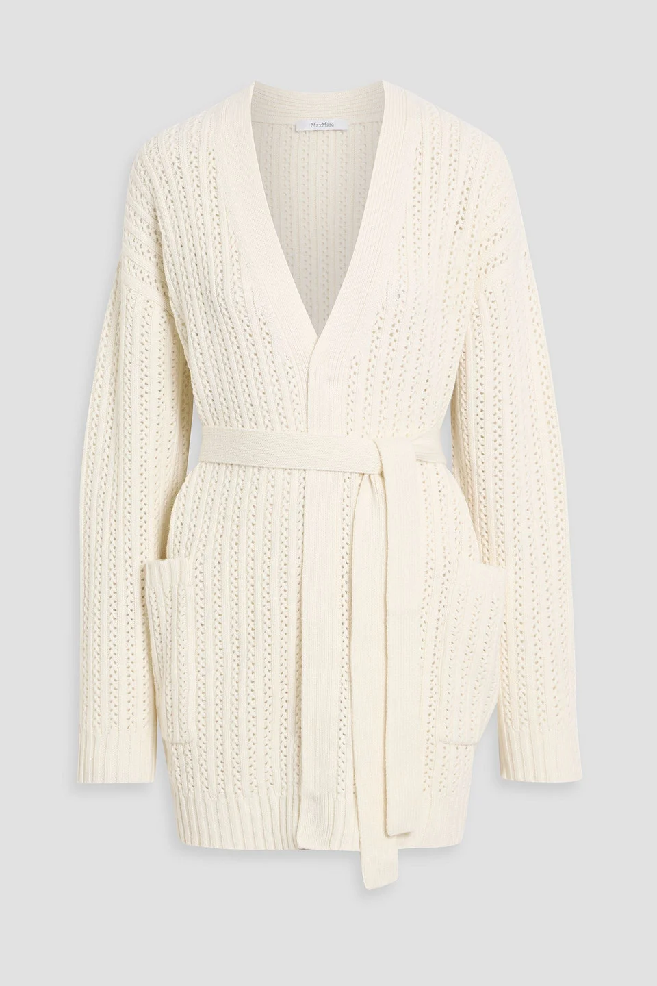 Cardigan pointelle-knit wool and cashmere-blend ribbed trims detachable waist tie front patch pockets slips on chunky knit hand wash or dry clean imported 70% Wool 30% Cashmere Product Code 46376663163033009