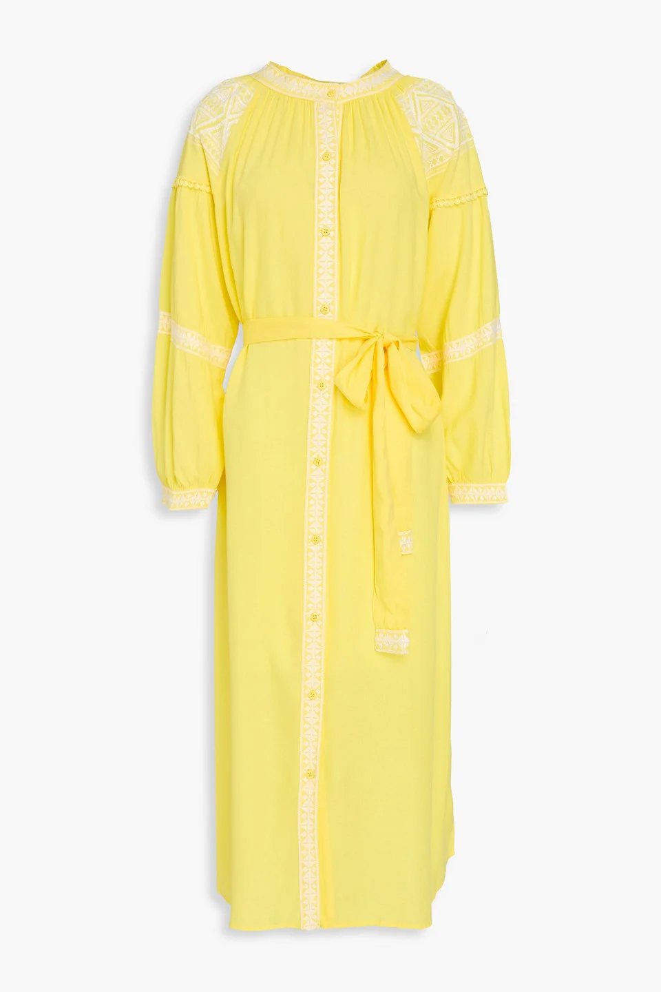 Dress voile embroidered crochet trims detachable waist tie two side slit pockets button fastenings through front lightweight, non-stretchy fabric hand wash or dry clean imported 100% Viscose Product Code 46376663162862101