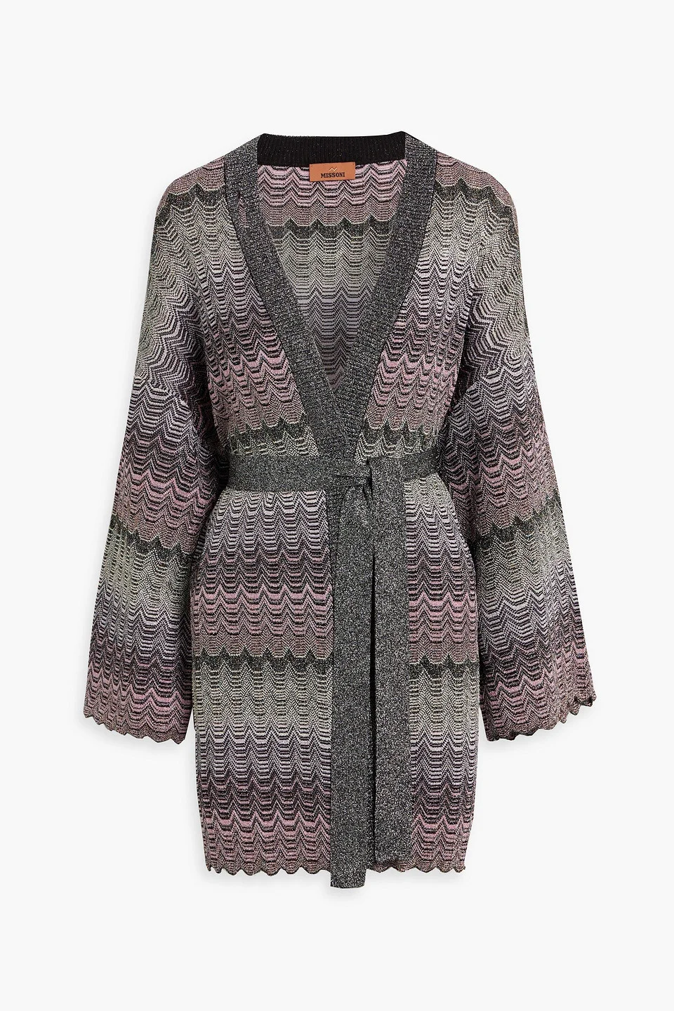 Cardigan metallic zigzag design crochet-knit ribbed trims scalloped trims detachable waist tie slips on mid-weight knit hand wash or dry clean imported 66% Viscose 34% Metallic fiber Product Code 46376663162896918