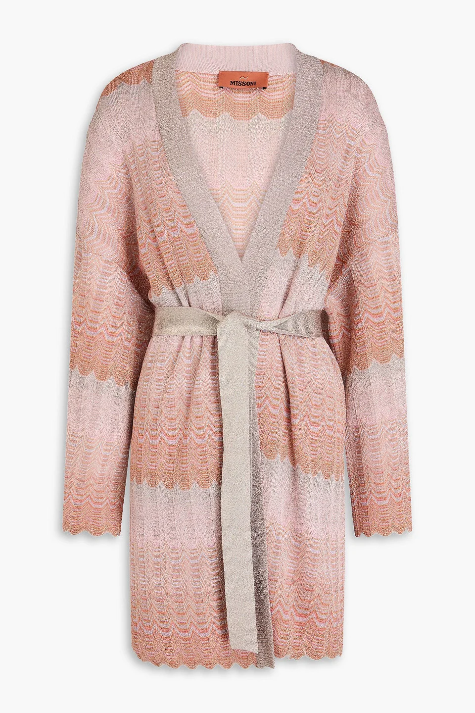 Cardigan metallic zigzag design crochet-knit ribbed trims scalloped trims detachable waist tie slips on mid-weight knit hand wash or dry clean imported 66% Viscose 34% Metallic fiber Product Code 46376663162882896