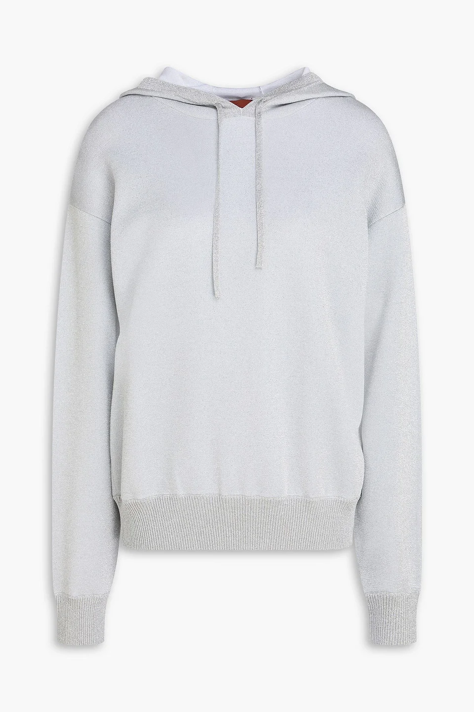 Sweater metallic knitted drawstring hood ribbed trims slips on dry clean imported 77% Viscose 11% Metallic fiber 11% Polyamide 1% Elastane Product Code 46376663163056157