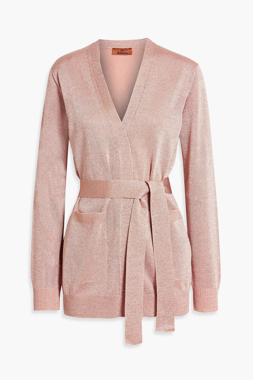 Cardigan metallic knitted ribbed trims detachable waist tie two front patch pockets slips on mid-weight knit hand wash or dry clean imported 70% Viscose 30% Metallic fiber Product Code 1647597359203122