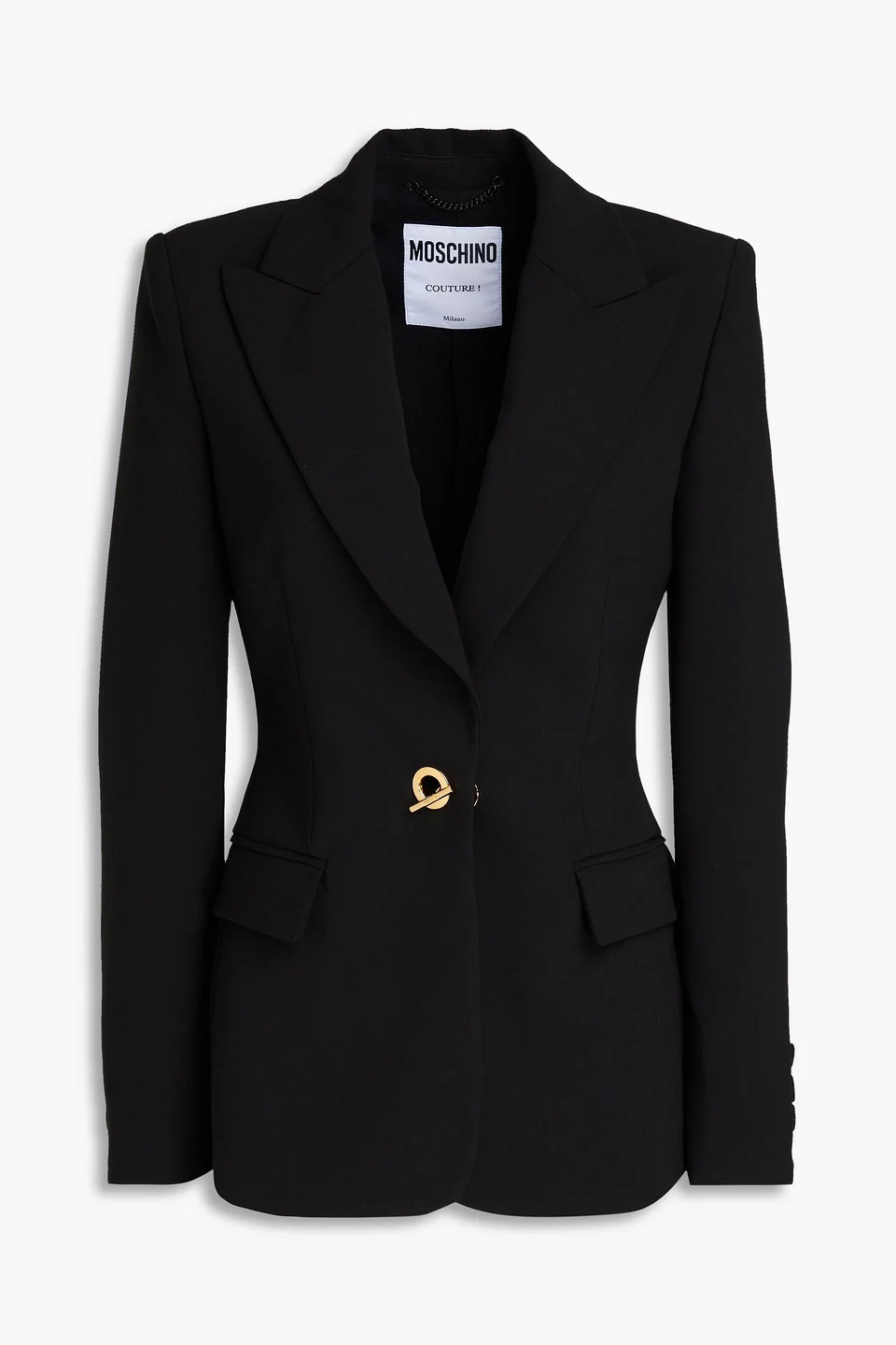 Blazer crepe shoulder pads buttoned cuffs two front flap pockets t-bar fastening at front fully lined mid-weight, non-stretchy fabric dry clean made in italy 88% Polyester 12% Elastane Product Code 1647597355932930