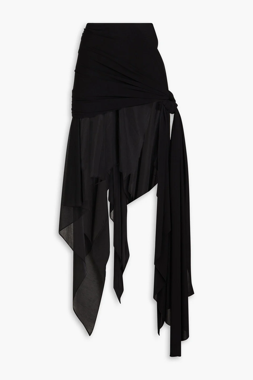 Skirt jersey crepe de chine paneled draped handkerchief hem concealed snap fastenings along side lightweight, slightly stretchy fabric dry clean imported Modeled after its signature 'Spirals', Mugler's skirt puts the 'less is more' philosophy to the test. It has a bikini-style waistline and jersey panel that's artfully knotted at one side, allowing the crepe de chine layer to drape from underneath. Wear yours with a triangle top and narrow, '90s-inspired sunglasses. 92% Viscose 8% Elastane Product Code 1647597346586213