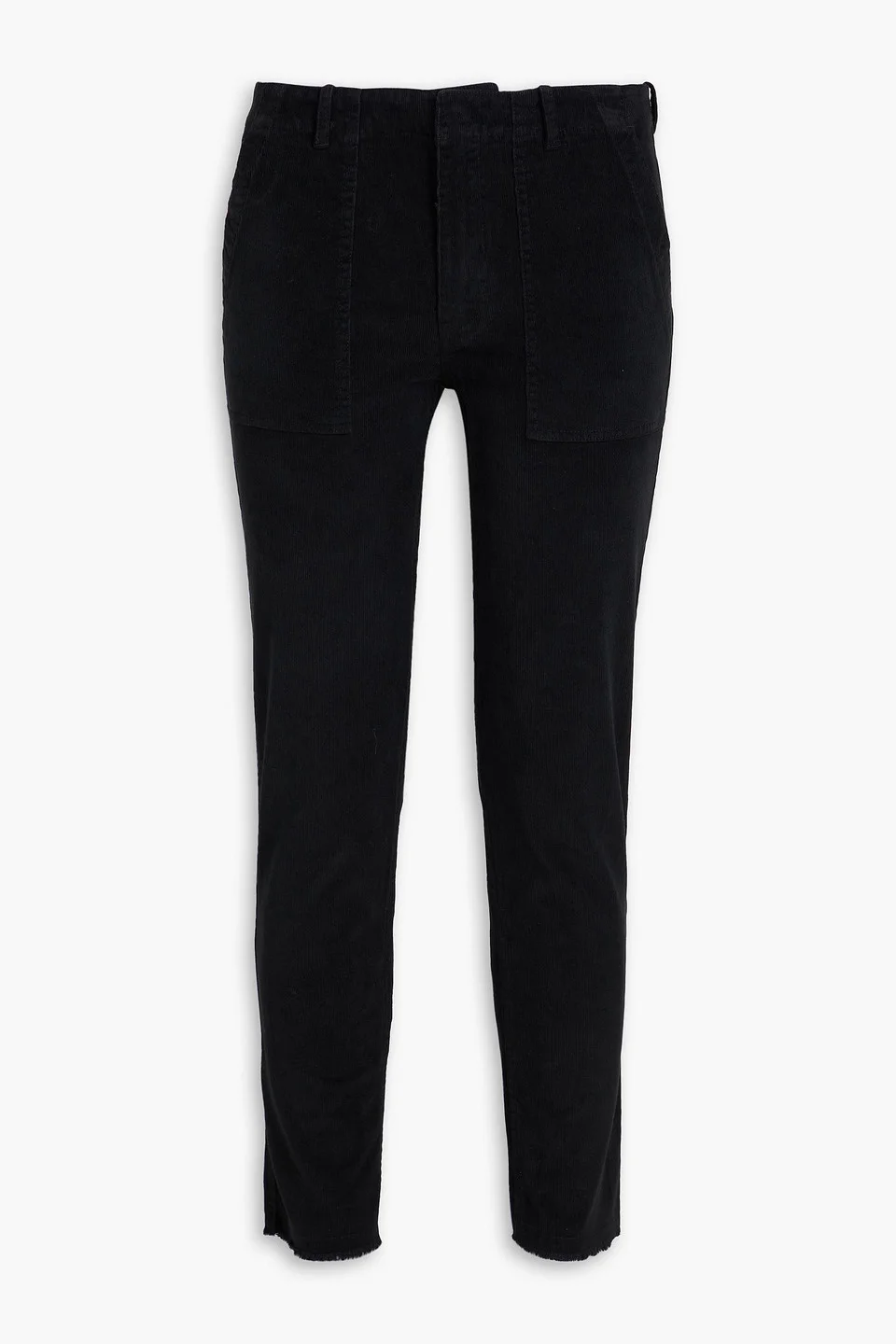 Slim-leg pants corduroy cotton-blend cropped two front patch pockets two back flap pockets belt loops mid-rise cut frayed cuffs concealed hook, button and zip fastening at front mid-weight, slightly stretchy fabric machine wash or dry clean 93% Cotton 6% Polyester 1% Spandex Product Code 1647597357748083