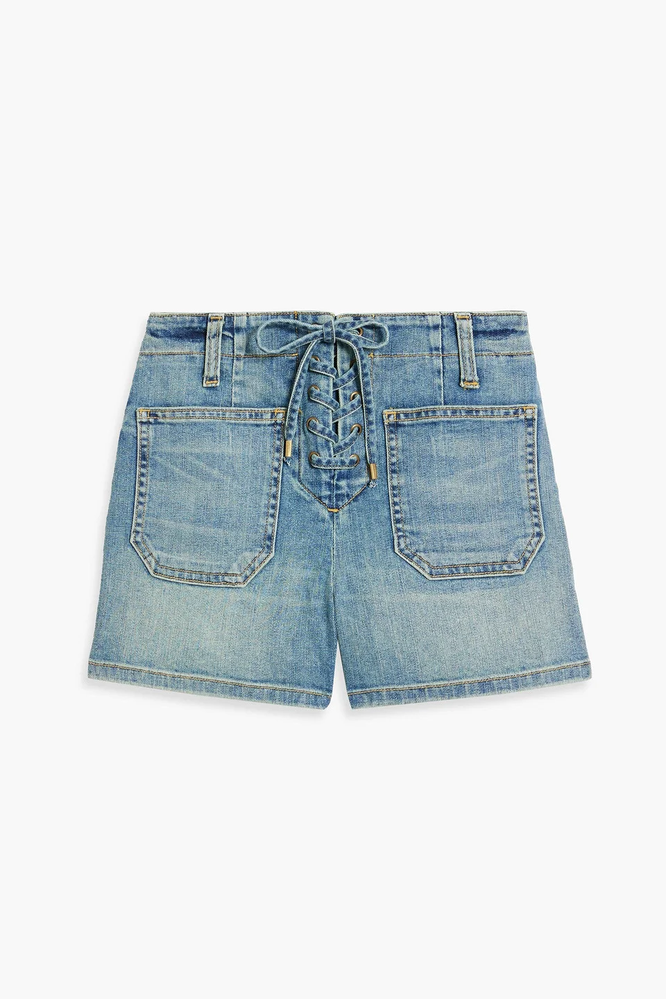 Shorts faded denim belt loops high-rise cut front patch pockets back patch pockets lace-up front mid-weight, non-stretchy fabric dry clean 98% Cotton 2% Polyurethane Product Code 1647597359312292
