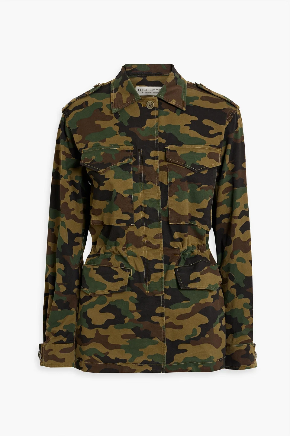 Jacket camouflage twill cotton-blend drawstring waist buttoned cuffs breast pockets two front flap pockets concealed snap and zip fastening at front slightly stretchy fabric mid-weight fabric dry clean 98% Cotton 2% Elastane Product Code 1647597308560649
