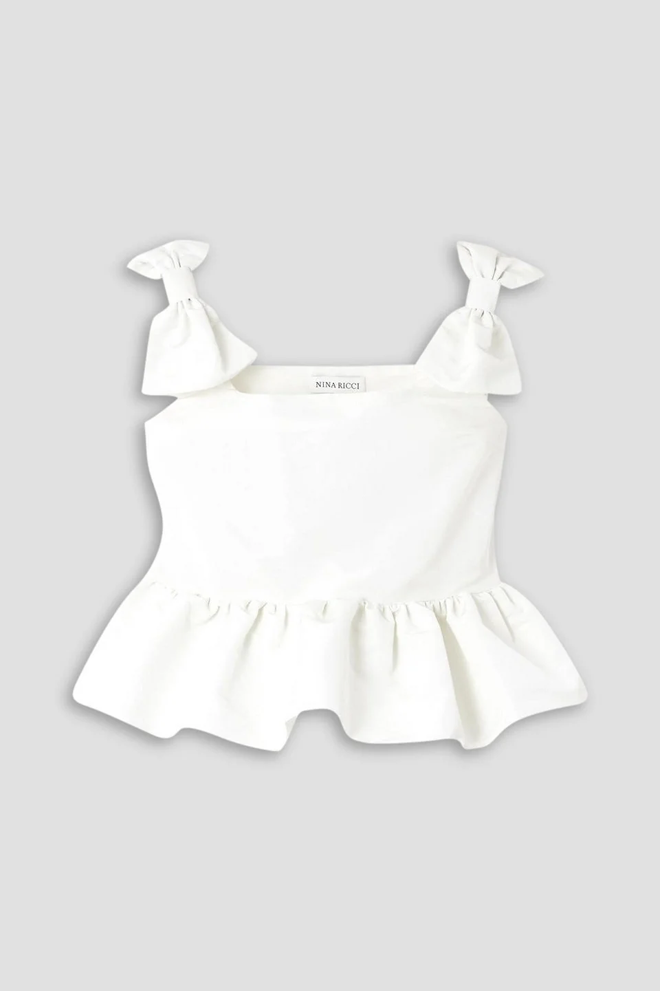 Top taffeta bow-detailed ruffled slips on mid-weight, non-stretchy fabric dry clean imported Nina Ricci's top is tailored in an elegant design that's enhanced by the bow-embellished straps. It’s made from taffeta with a peplum hem and is cut for a cropped silhouette. Wear yours with jeans or tailored pants. 100% Recycled polyester Product Code 1647597325271477