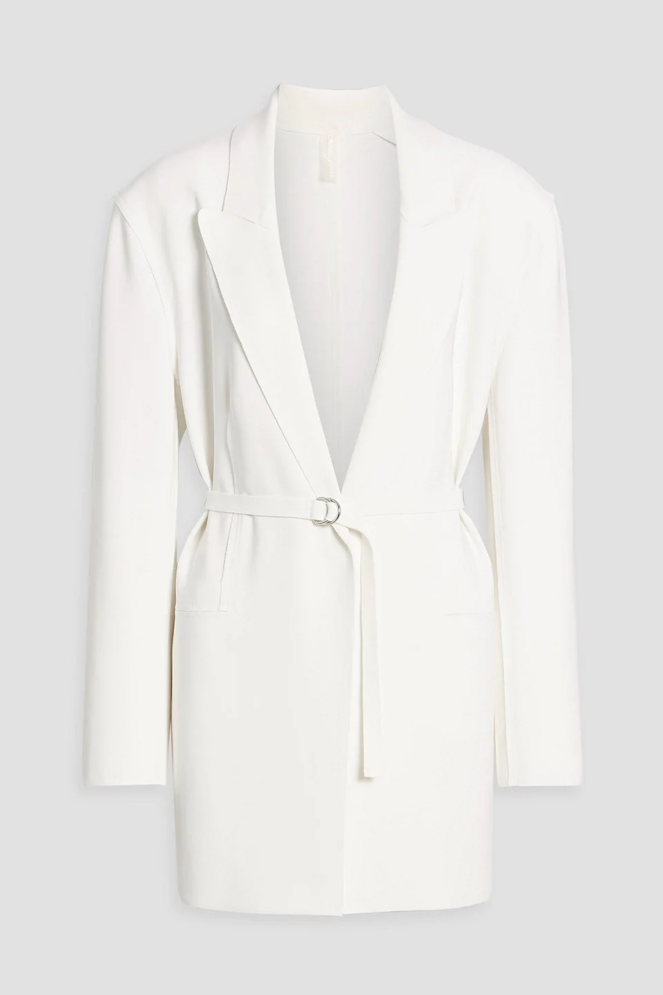 Blazer cady shoulder pads detachable belt slit cuffs front welt pockets velcro® fastening at front mid-weight, slightly stretchy fabric machine wash imported 95% Polyester 5% Spandex Product Code 46376663163041802