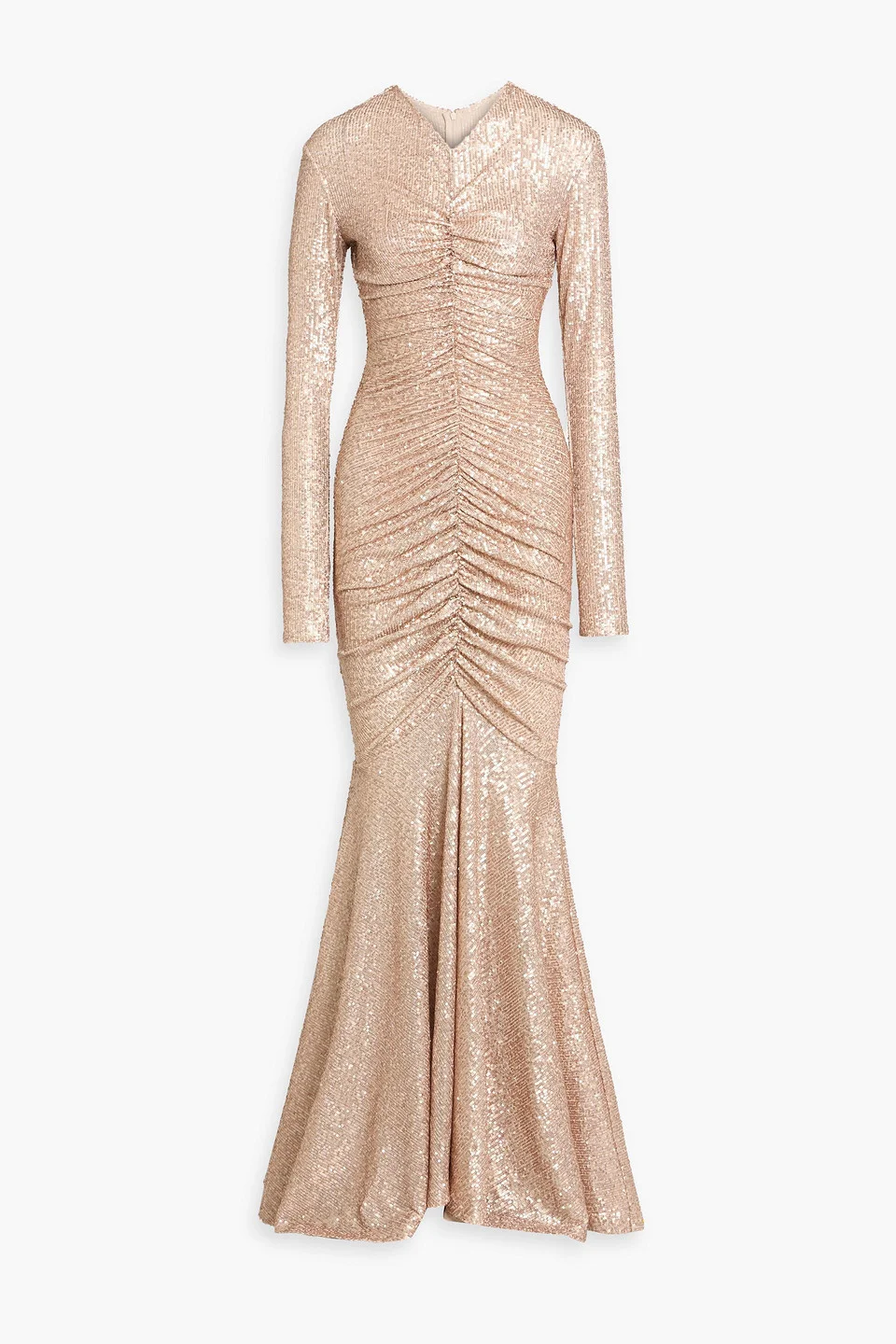 Gown stretch-mesh sequins ruched fluted hem concealed zip fastening along back lightweight, heavily embellished fabric hand wash imported 95% Polyester 5% Elastane Product Code 46376663163121755