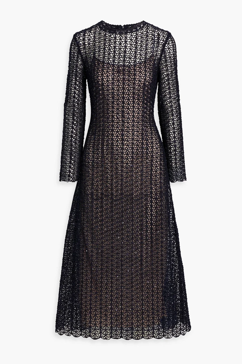 Dress crochet cotton and silk-blend sequins concealed hook and zip fastening at back detachable slip to line mid-weight open knit dry clean made in italy Crocheted from a cotton and silk blend yarn, this Oscar de la Renta dress is embellished with delicate sequins that offer subtle sparkle with every step. It features modest long sleeves and a demure midi-length hem, suitable for more traditional affairs. The detachable slip lining is complete with a tulle overlay —further highlighting the house’s attention to detail. 60% Cotton 40% Silk Product Code 1647597345617179