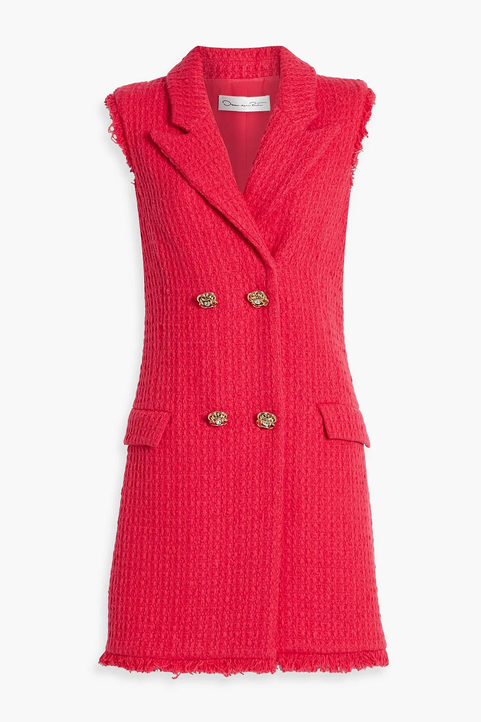 Dress tweed wool-blend crystal buttons frayed trims two front flap pockets concealed snap fastenings through double-breasted front fully lined mid-weight, non-stretchy fabric dry clean made in italy 56% Virgin Wool 40% Cotton 4% Polyamide Product Code 1647597359617719
