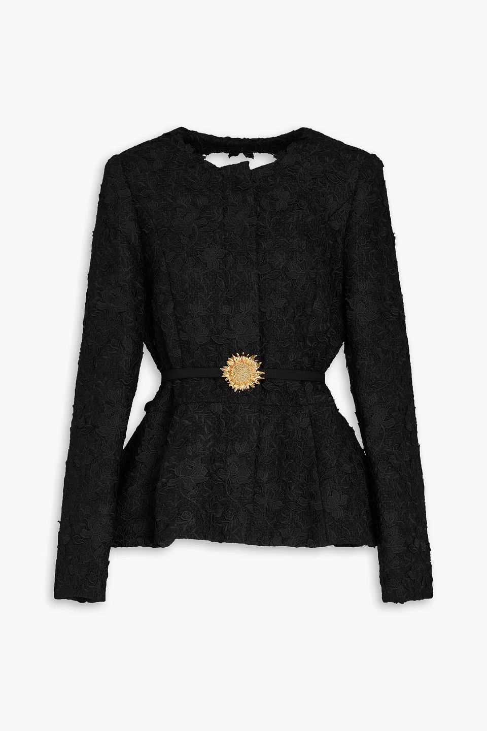 Jacket tweed embroidered floral appliques cutout shoulder pads detachable belt concealed snap fastenings through front fully lined mid-weight, non-stretchy fabric dry clean made in italy 90% Polyester 10% Wool Product Code 1647597326052181
