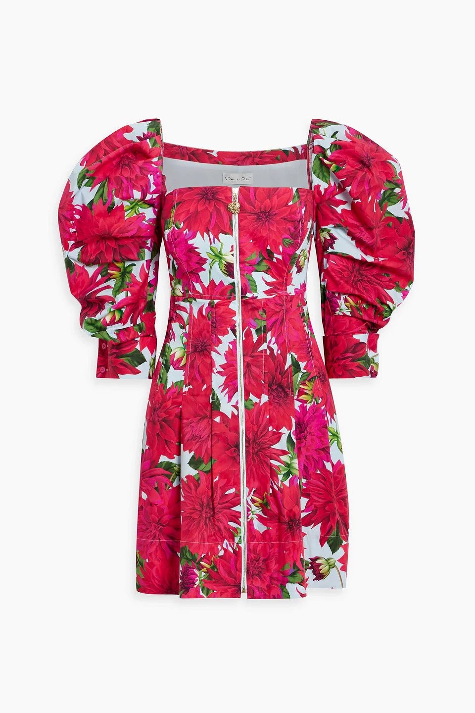 Dress floral-print cotton-blend poplin pleated puffed sleeves side slit pockets zip fastening through front mid-weight, slightly stretchy fabric dry clean made in italy The party’s in full bloom with Oscar de la Renta’s dahlia-print mini dress. Made from cotton-blend poplin, the squared neckline shows off your decolletage with a gilded front zipper. Another standout? The structured puffed sleeves are sure to make a statement. 97% Cotton 3% Elastane Product Code 46376663162920674