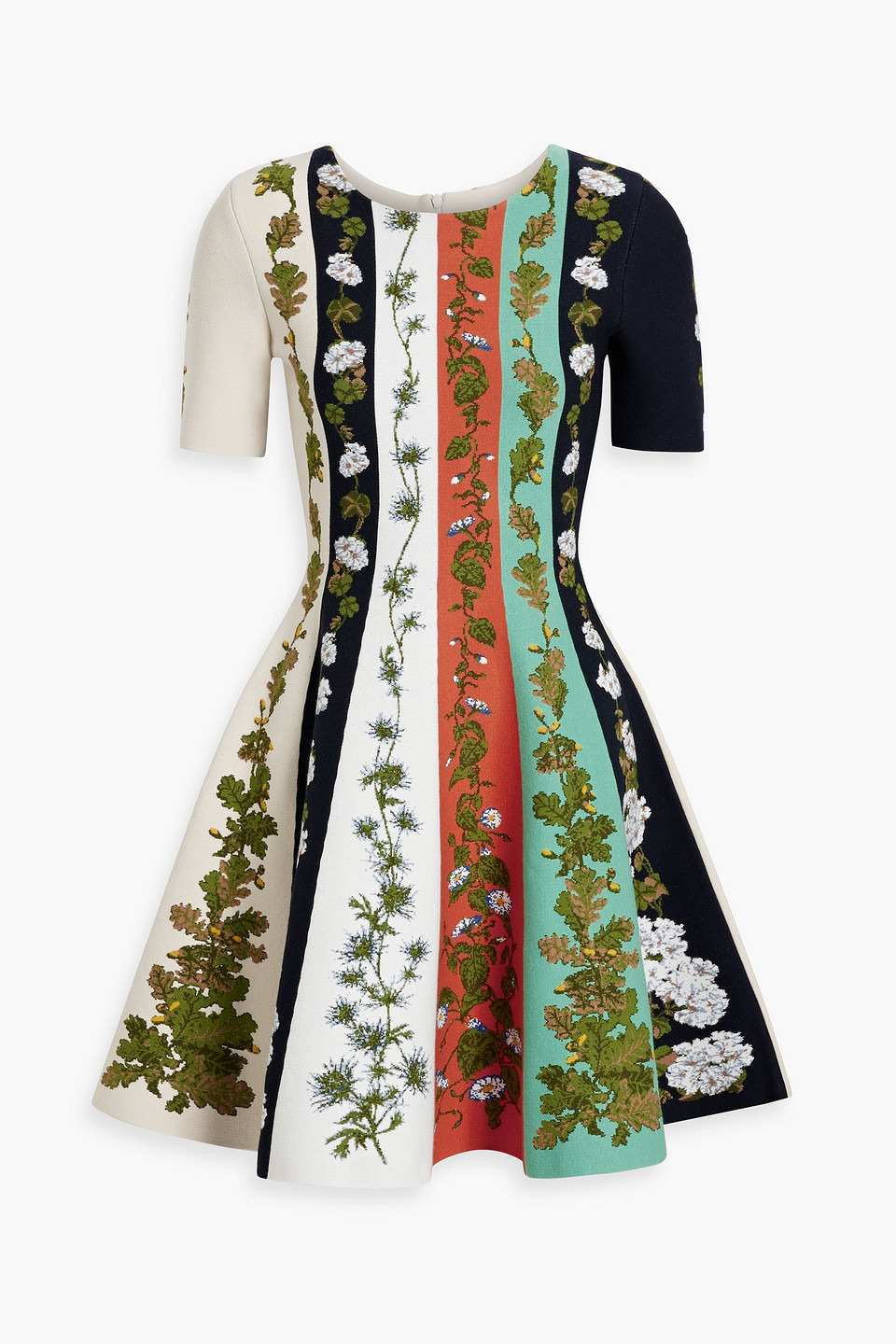 Dress floral-design jacquard-knit concealed hook and zip fastening along back mid-weight knit dry clean made in italy Oscar de la Renta’s mini dress features multi-colored stripes strewn with florals. Jacquard-knitted with expert attention to detail, the playful design accentuates the slim fitting bodice and bouncy flared hem. Branch out for your next luncheon or daytime social styling it with turquoise accessories. 67% Viscose 29% Polyester 3% Polyamide 1% Elastane Product Code 1647597345614682