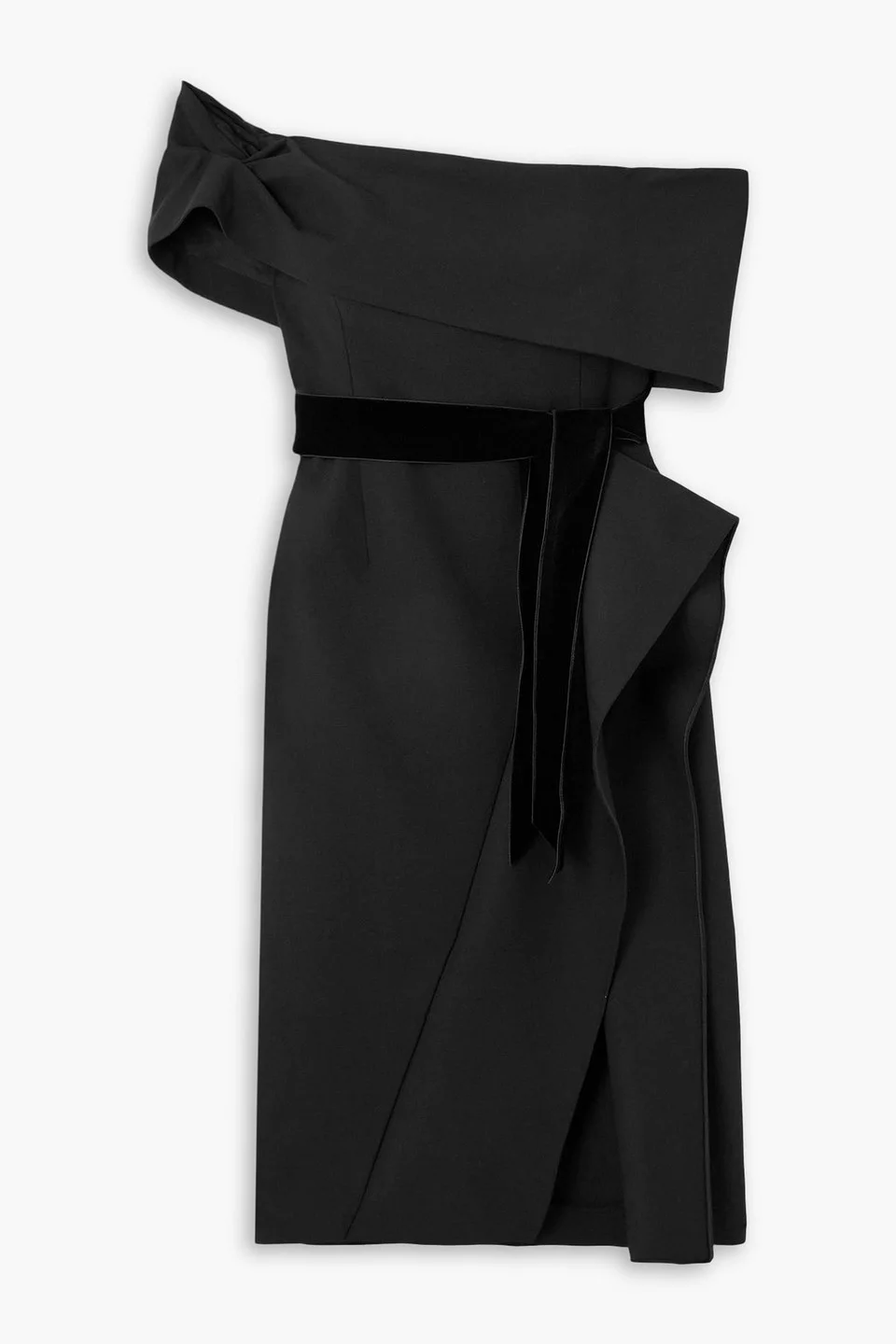 Off-the-shoulder dress grain de poudre wool-blend velvet trims draped detachable waist tie front slit concealed hook and zip fastening at back fully lined mid-weight, slightly stretchy fabric dry clean made in italy 94% Virgin Wool 5% Elastane 1% Other Fibres Product Code 1647597342453249