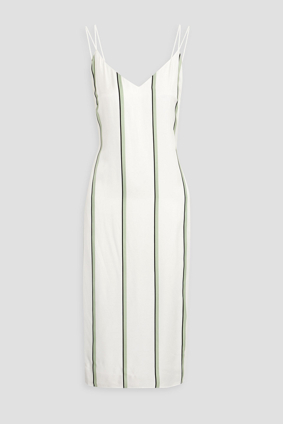 Dress striped satin adjustable straps back split fully lined concealed zip fastening along side non-stretchy fabric lightweight fabric machine wash or dry clean imported 63% Viscose 37% Silk Product Code 1647597309397657