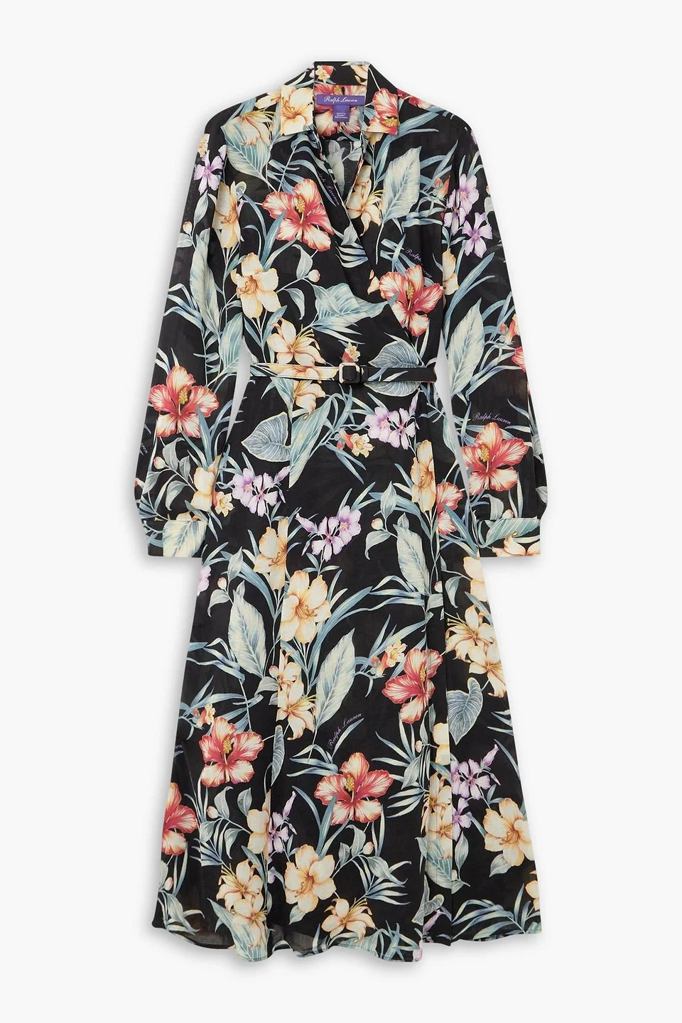 Wrap dress floral-print woven buttoned cuffs button fastening at front mid-weight, non-stretchy fabric dry clean imported The florals on Ralph Lauren’s wrap dress are major , and will fit the bill for events near the coast or in the city. It’s made from lightweight woven fabric with a pointed collar and belted waist. Just add heels and colorful clutch. 60% Viscose 40% Linen Product Code 46376663162971039