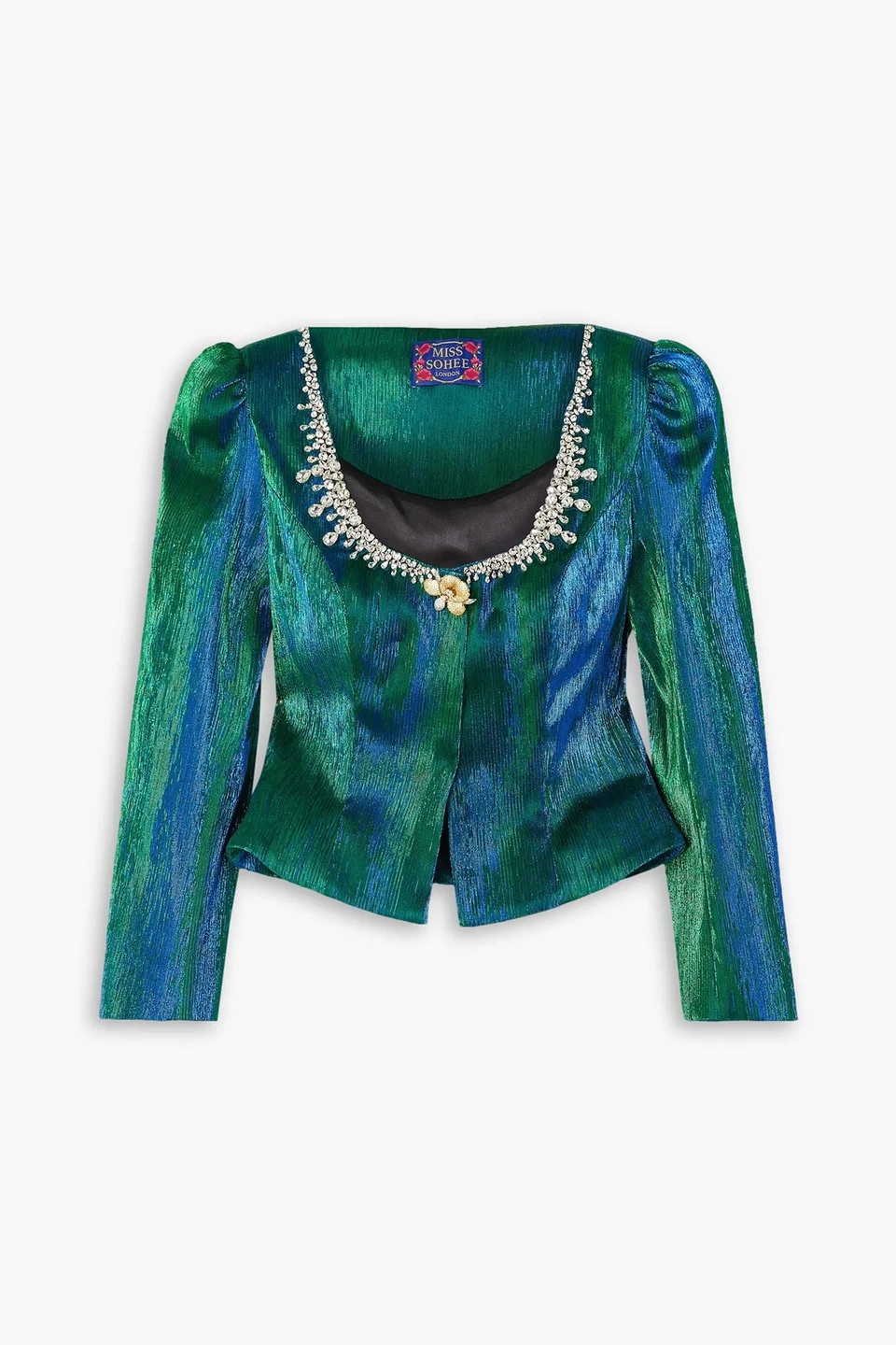 Jacket lame brooch crystals shoulder pads concealed snap fastenings through front fully lined slightly stretchy fabric mid-weight fabric dry clean made in uk 50% Acetate 28% Polyamide 18% Polyester 4% Elastane Product Code 1647597324192235