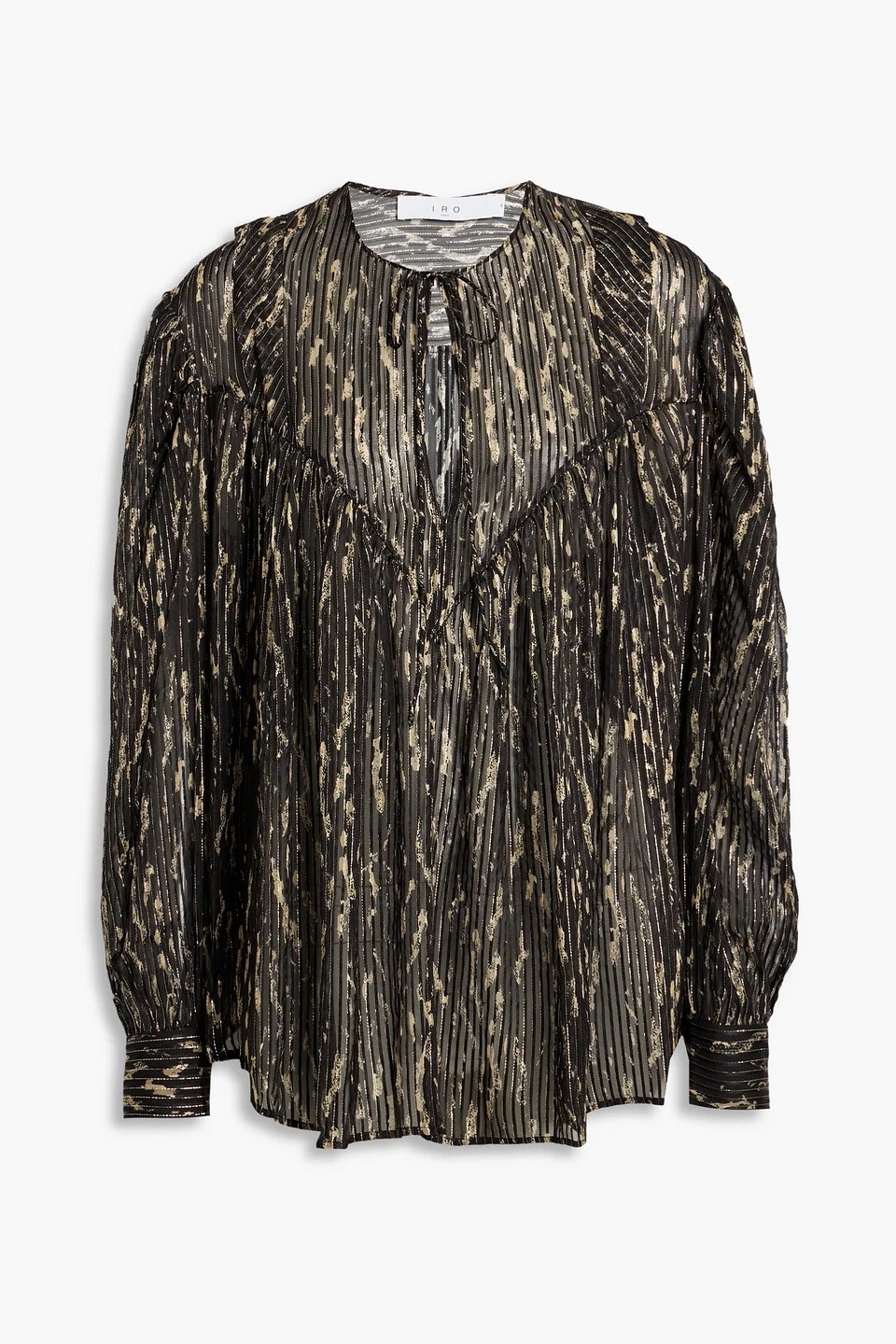 Blouse printed metallic jacquard silk-blend gathered sleeves buttoned cuffs tie-fastening keyhole at front non-stretchy fabric lightweight fabric dry clean imported 97% Silk 3% Polyester Product Code 1647597307162523