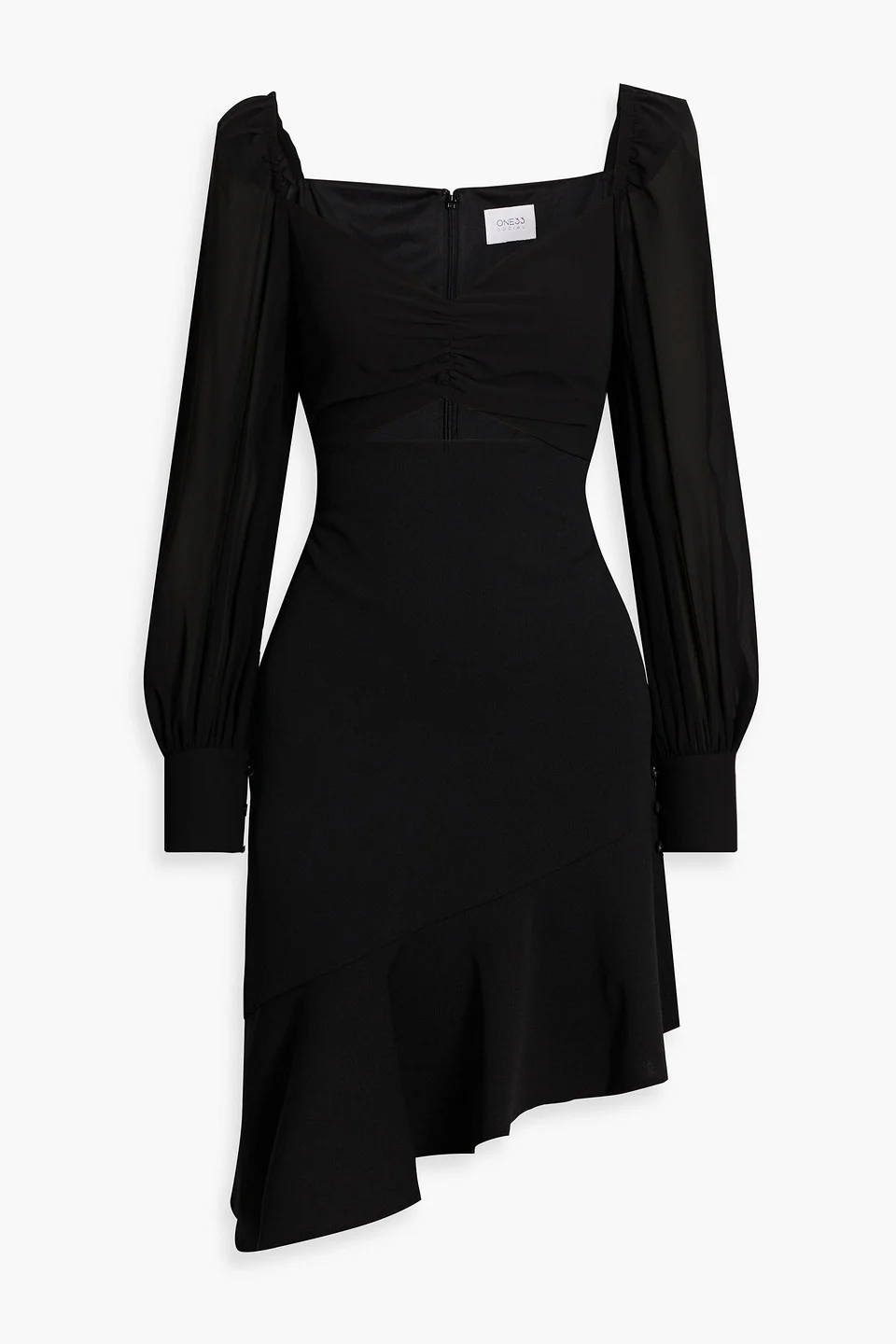 Dress crepe de chine gathered cutout paneled buttoned cuffs asymmetric hem concealed hook and zip fastening at back non-stretchy fabric mid-weight fabric dry clean imported 95% Polyester 5% Spandex Product Code 1647597304688439