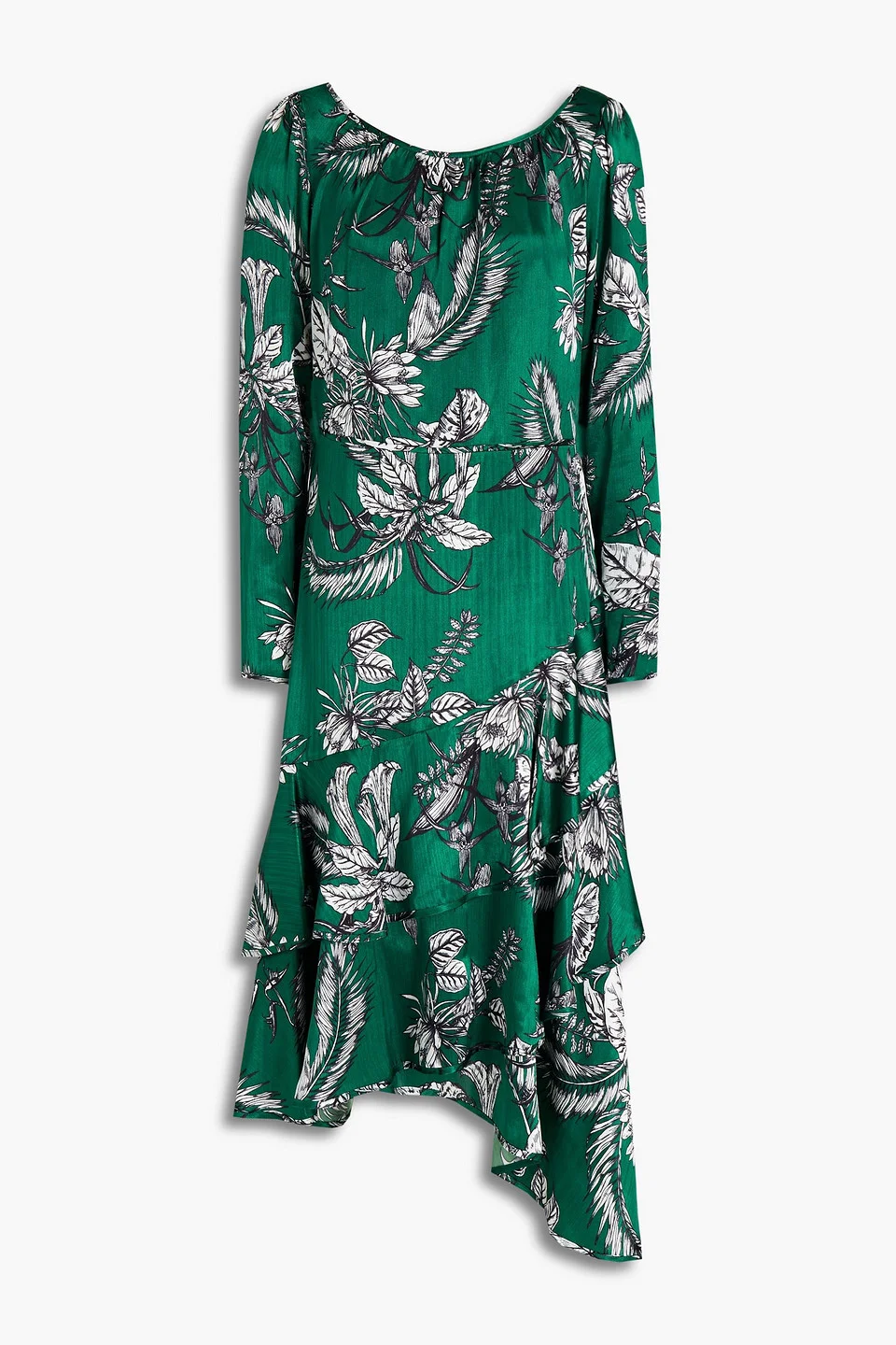Dress printed satin gathered tiered zipped cuffs concealed hook and zip fastening at back fully lined asymmetric hem non-stretchy fabric mid-weight fabric dry clean imported 100% Polyester Product Code 42247633209093531